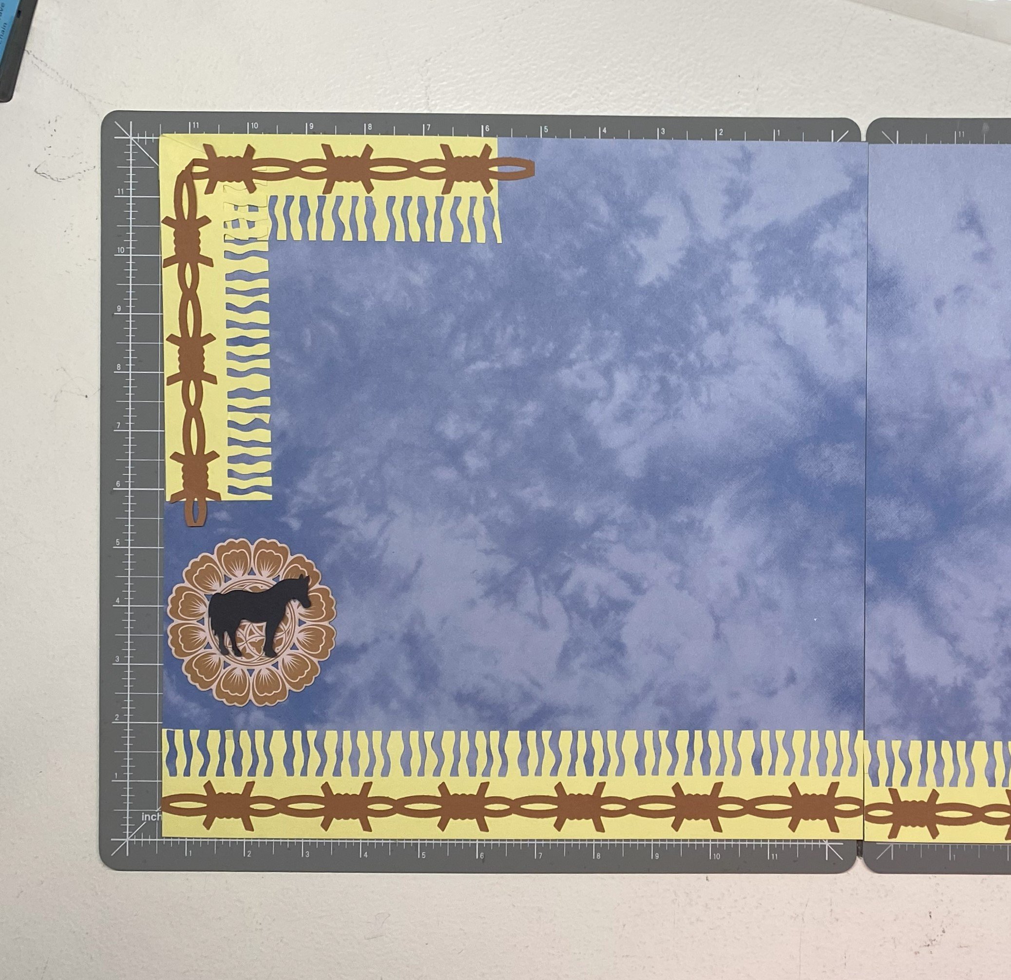 Designer Paper base, /Folded Corner Embellishment created with CM Zebra Stripe, Barbed Wire BMC and Horse Stand-alone punch.